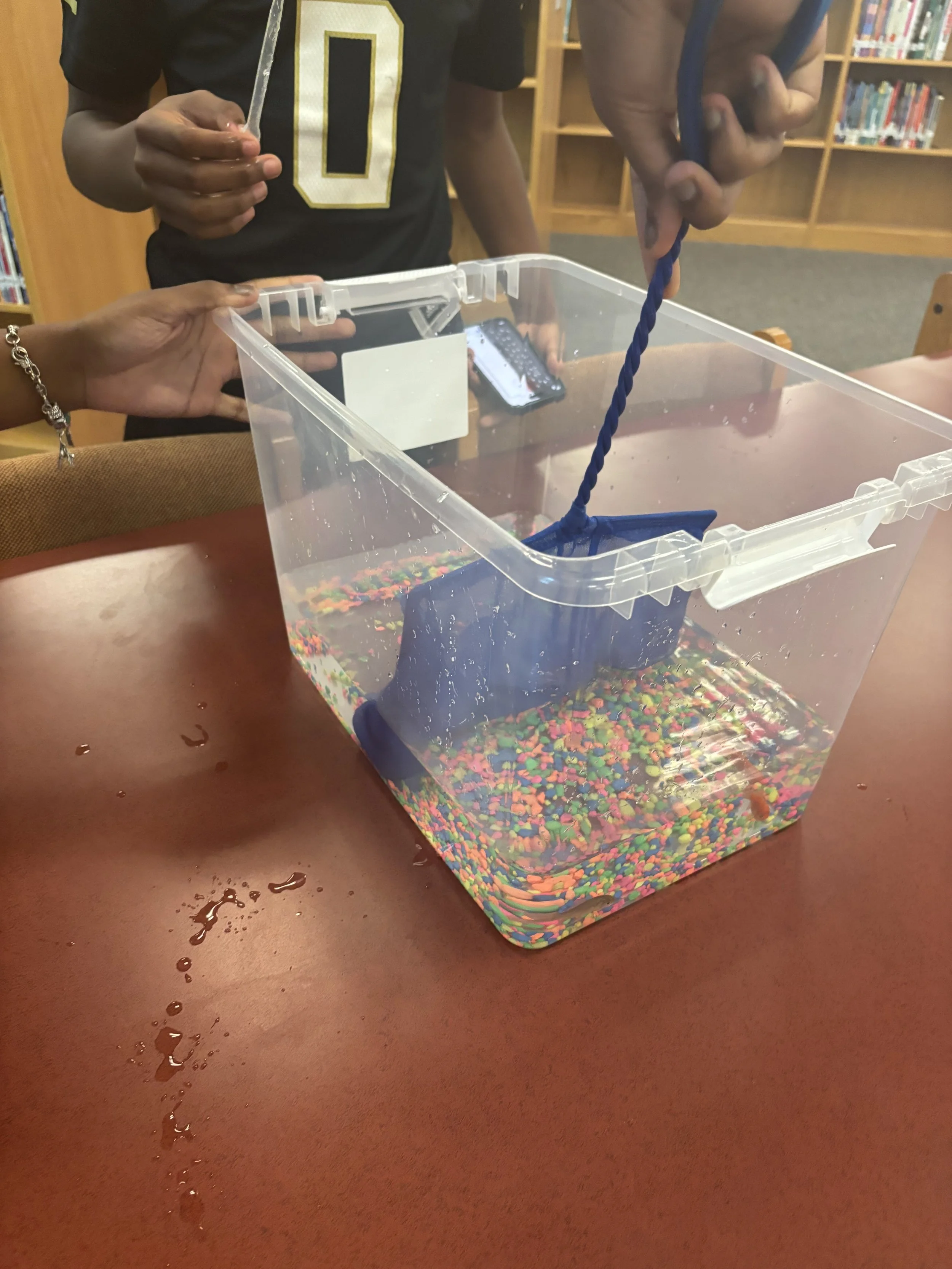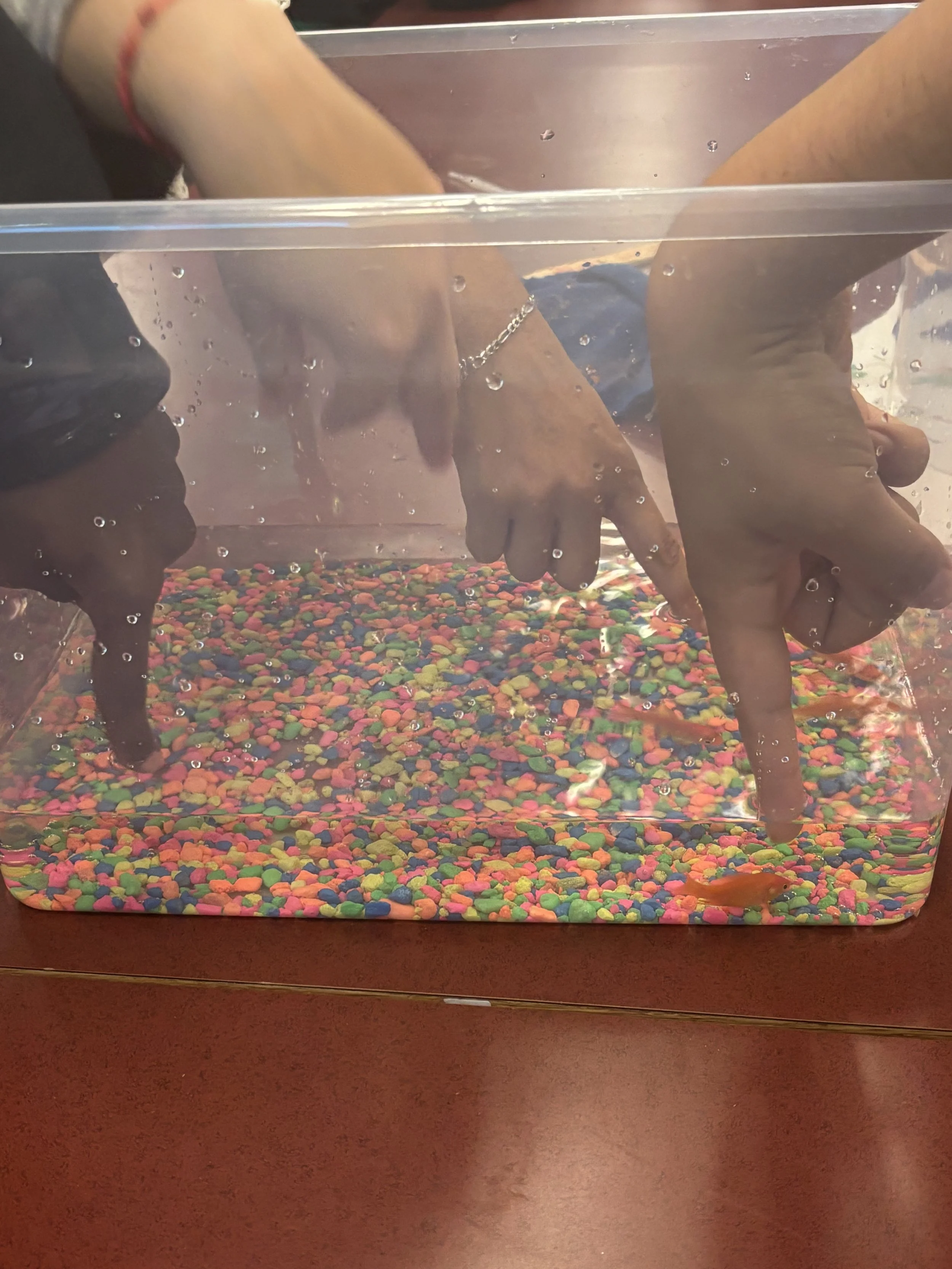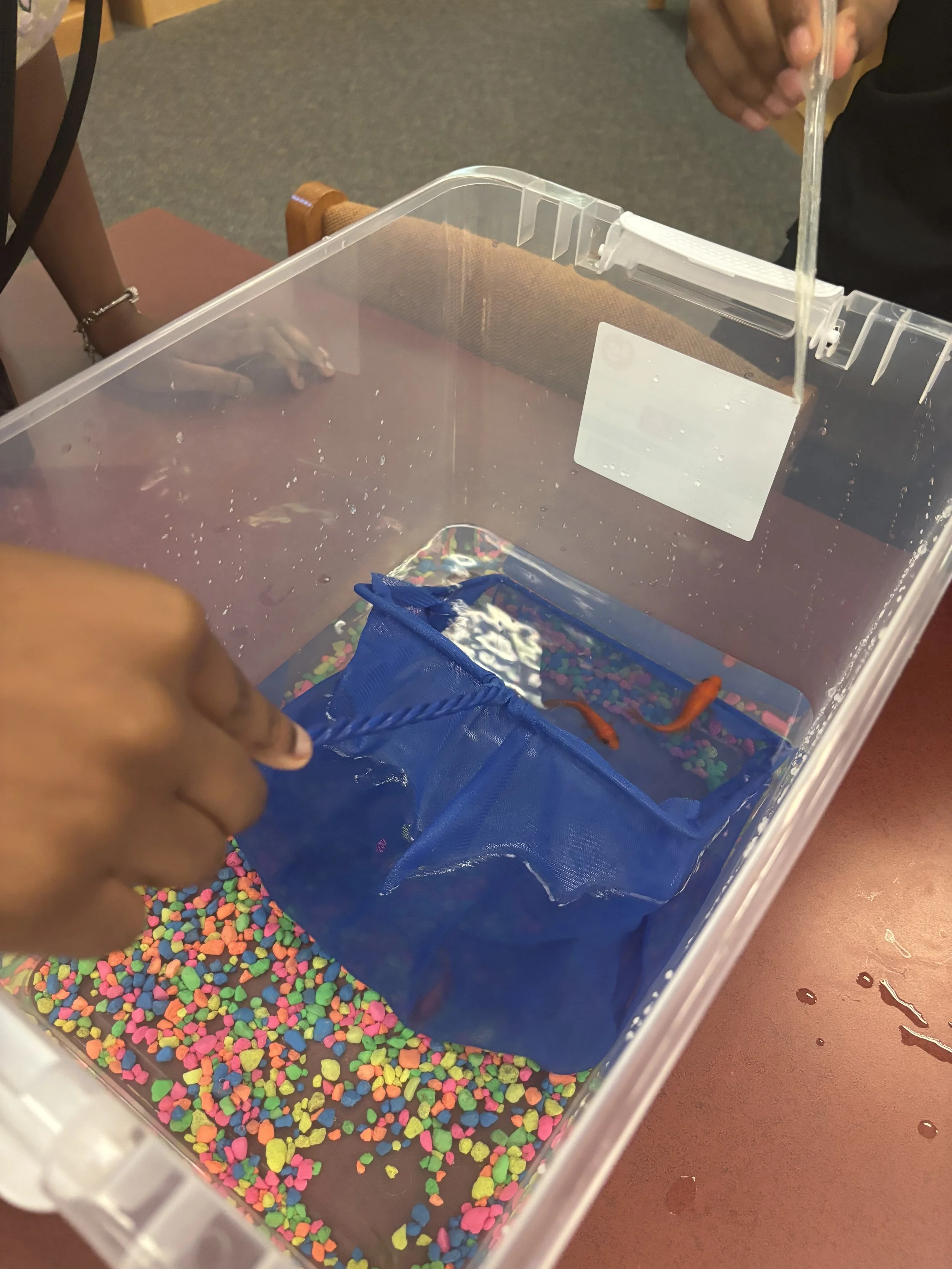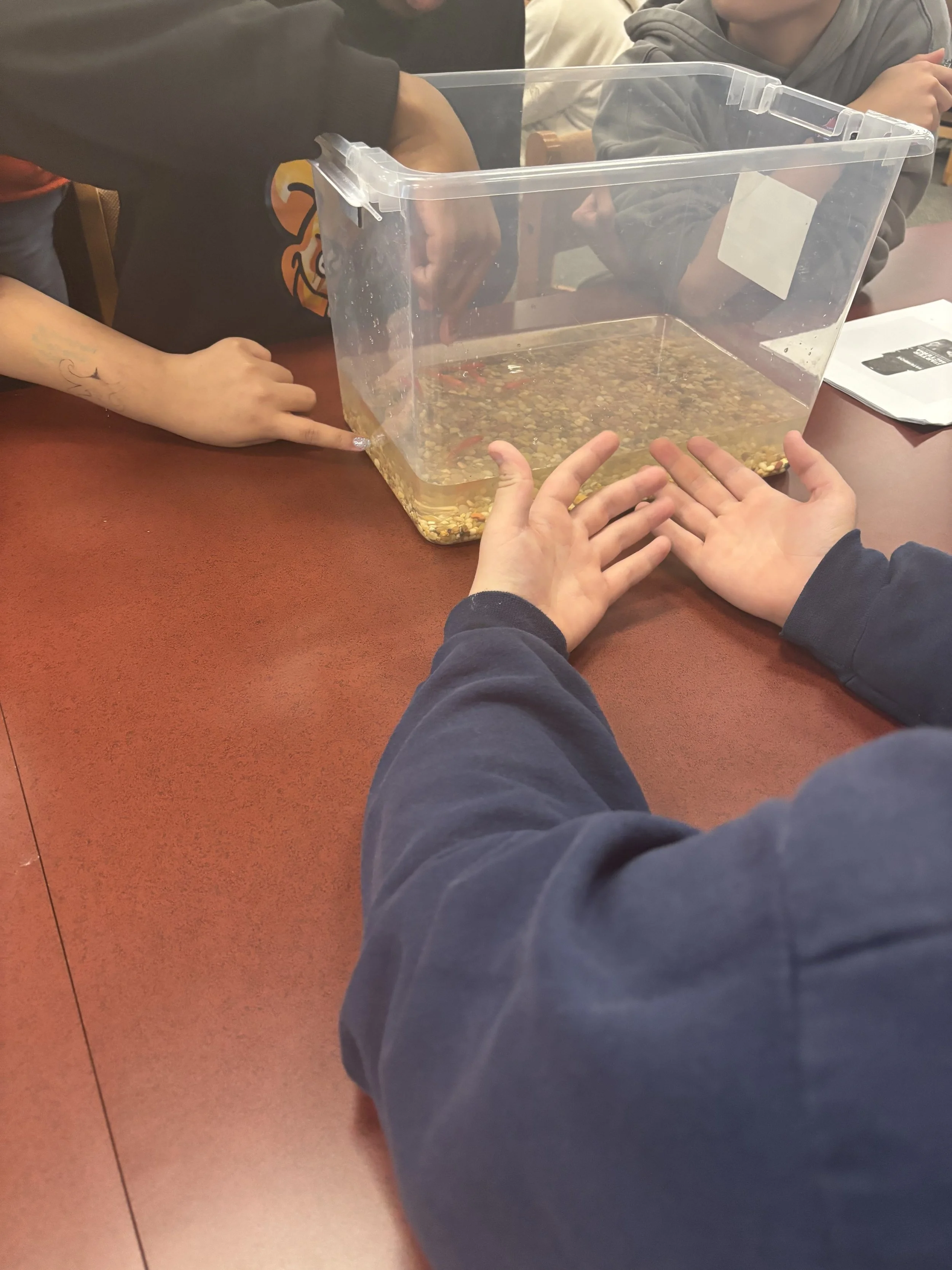 Students trying to touch goldfish after adding it to their bucket