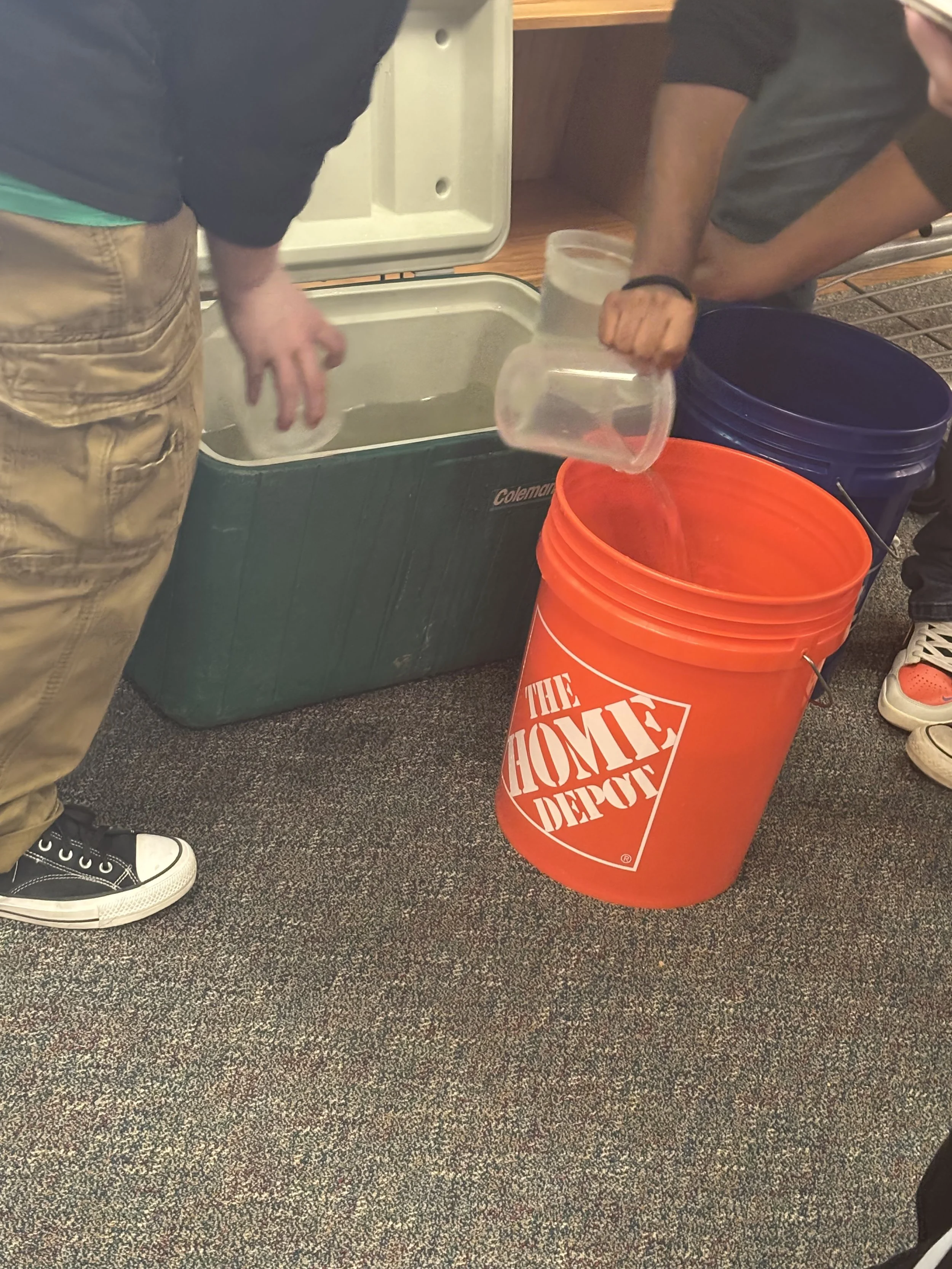 Students adding water to buckets for Goldfish